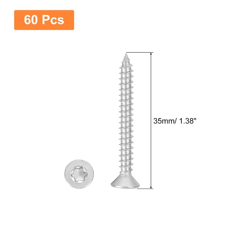 sourcing map 60Pcs Flat Head Torx Screws, M4 x 35mm 304 Stainless Steel Countersunk Self Tapping Anti-Theft Wood Screws Tamper Resistant Screws Fit T20 Bit for Wood, Fence, Decking (Silver)