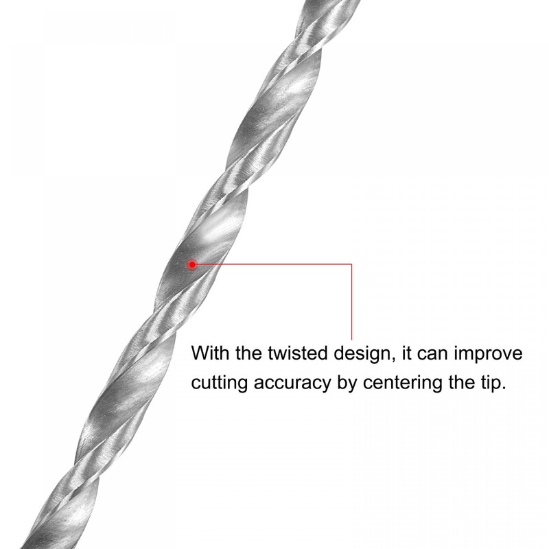 - [Twisted Design]- With the twisted design, it can improve cutting accuracy by centering the tip. It can avoid displacement of the drill bit during work, and at the same time remove debris and particles faster and easier.