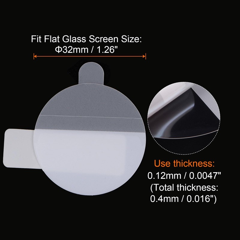 - Size - Fit glass screen size: 32mm / 1.26", Use thickness: 0.12mm / 0.0047", Total thickness: 0.4mm / 0.016", (suitable for flat screens, not for curved screens.); Compatible brand: universal; Shape: round. Packaging includes: 6pcs film, 1pcs dustproof cloth, 6pcs dust removal sticker, 1pcs scraping card, and 1pcs kraft paper bag.