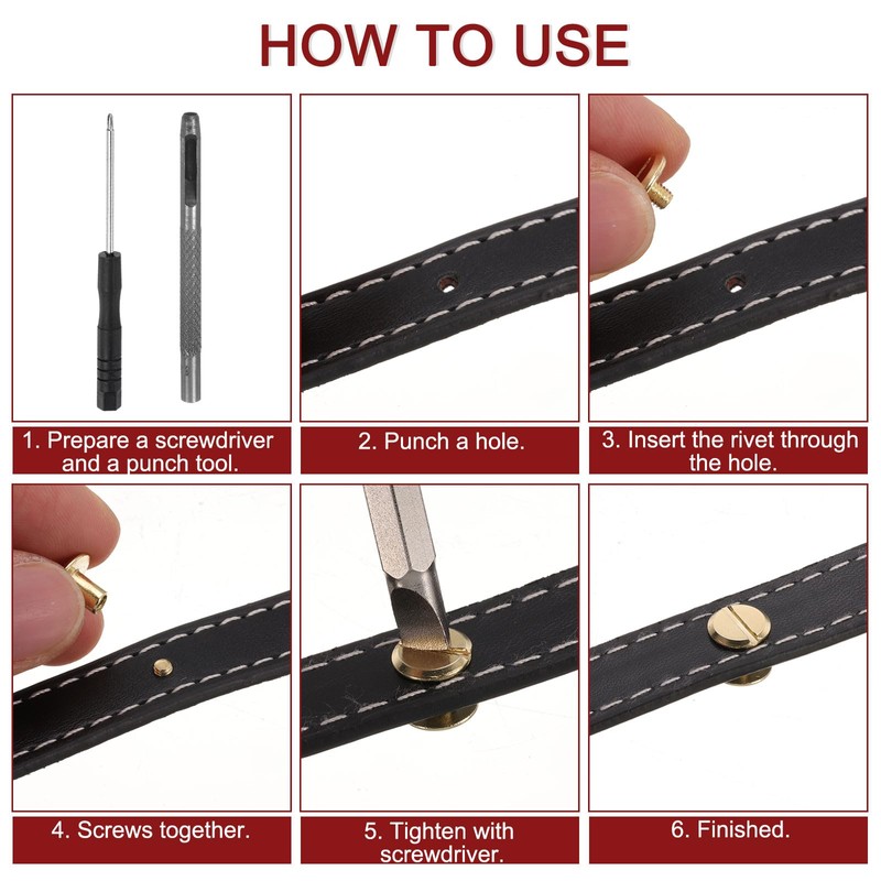 • Durable Material: Made of carbon steel, these leather rivets are durable, smooth and burr-free. The screw rivets for leather are wear-resistant, waterproof and rust-proof, and can withstand frequent use without breaking or deforming.