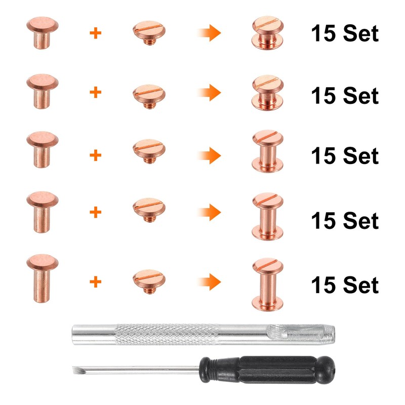 • Size: Chicago Screw Size: M5x6,8,10,12mm; Package Content: each size 15 sets, a total of 75 set, 1 leather hole punch, 1 Phillips screwdriver.