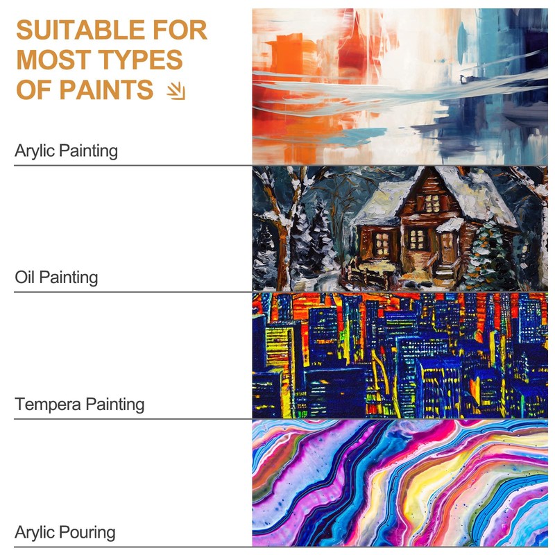 - 1.Superior Paint Adhesion - The medium-textured cotton surface holds paint beautifully without excessive absorption.2. Long-Lasting Artwork - Acid-free materials prevent yellowing over time.3.Stable Painting Surface - Sturdy construction prevents warping even in humid conditions.4.Time-Saving - Pre-primed and ready to use right out of the package.5.Versatile - Works well with oil paints, acrylics, and other wet media