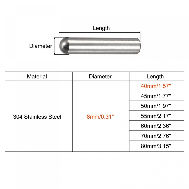 - Dowel pins diameter: 8mm/0.31"; Length of dowel pins: 40mm/1.57"; Package includes: 10pcs x Dowel Pins