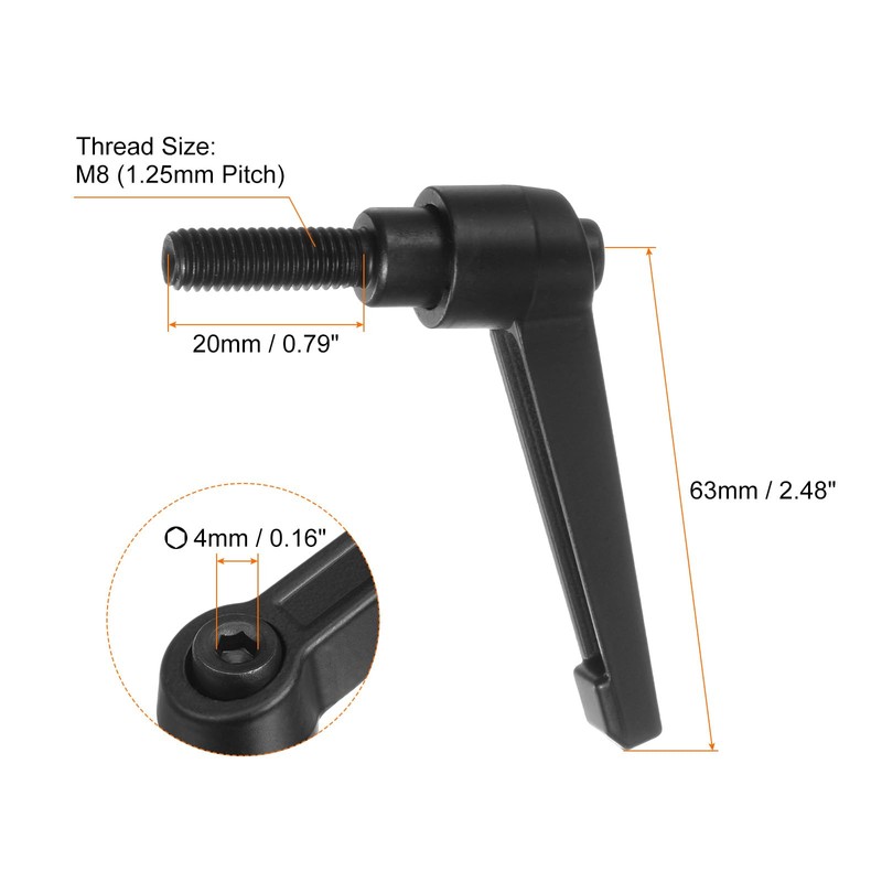 - Size - Thread size: M8 (1.25mm pitch); thread length: 20mm / 0.79"; lever length: 63mm / 2.48"; hex socket size: 4mm / 0.16"; color: black