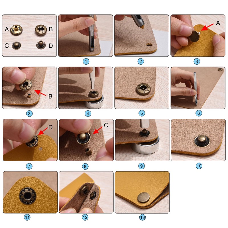 - Leather press studs: button caps are approx. 0.47 inches/12 mm in diameter and 0.22 inches/5.5 mm in height. Each kit contains (cap + socket) with (bolt + washer), total 90 set, including 6 colors, each color 15 set. All tools are stored in a clear storage box to avoid messing up the colours of the buttons. So you can quickly find what you need.