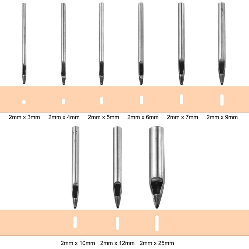- Size - Oval Hole Punch 9 Different Specification: 2mm x 3mm, 2mm x 4mm, 2mm x 5mm, 2mm x 6mm, 2mm x 7mm, 2mm x 9mm, 2mm x 10mm, 2mm x 12mm, 2mm x 25mm; Shape: Oval Hole; Type: Flat Punch Set; Package Content: 9pcs Flat Leather Punch (One of each size).
