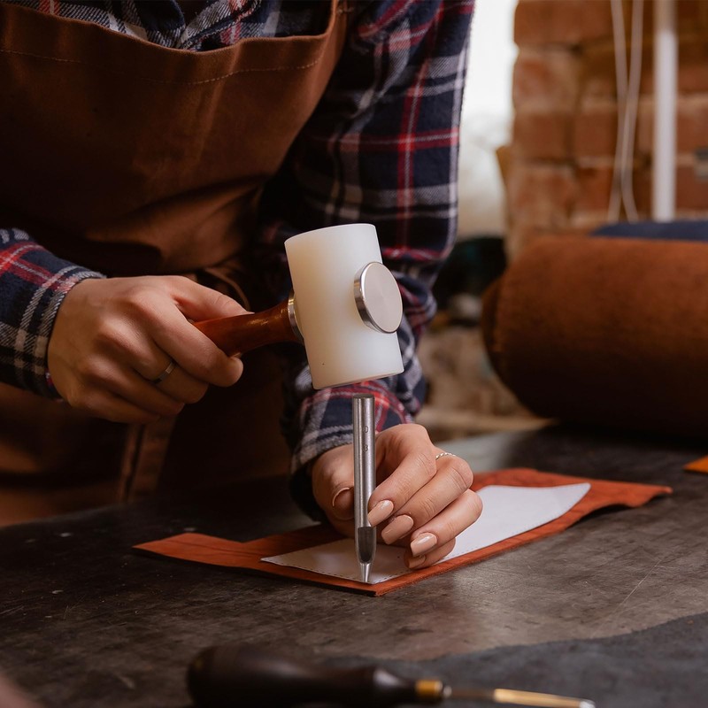 Place a hollow punch on the leather fabric, and hit the back end with a mallet or hammer.