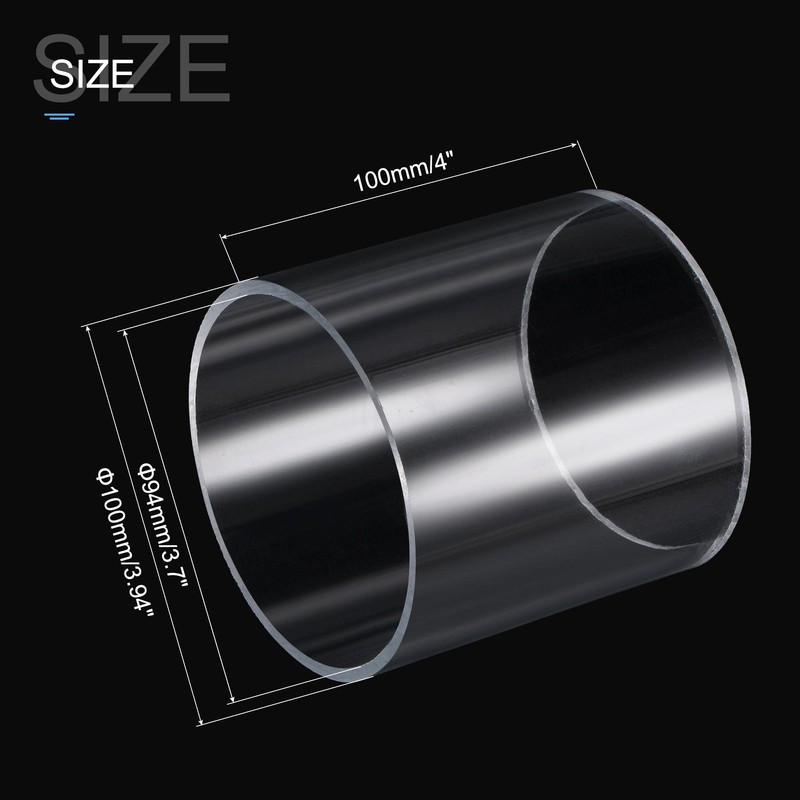 The acrylic plastic tubing, is in size of : 94mm/3.7-inch inner dia, 100mm/3.94-inch outer dia, 100mm/4-inch total length, 3mm/0.12-inch wall thickness