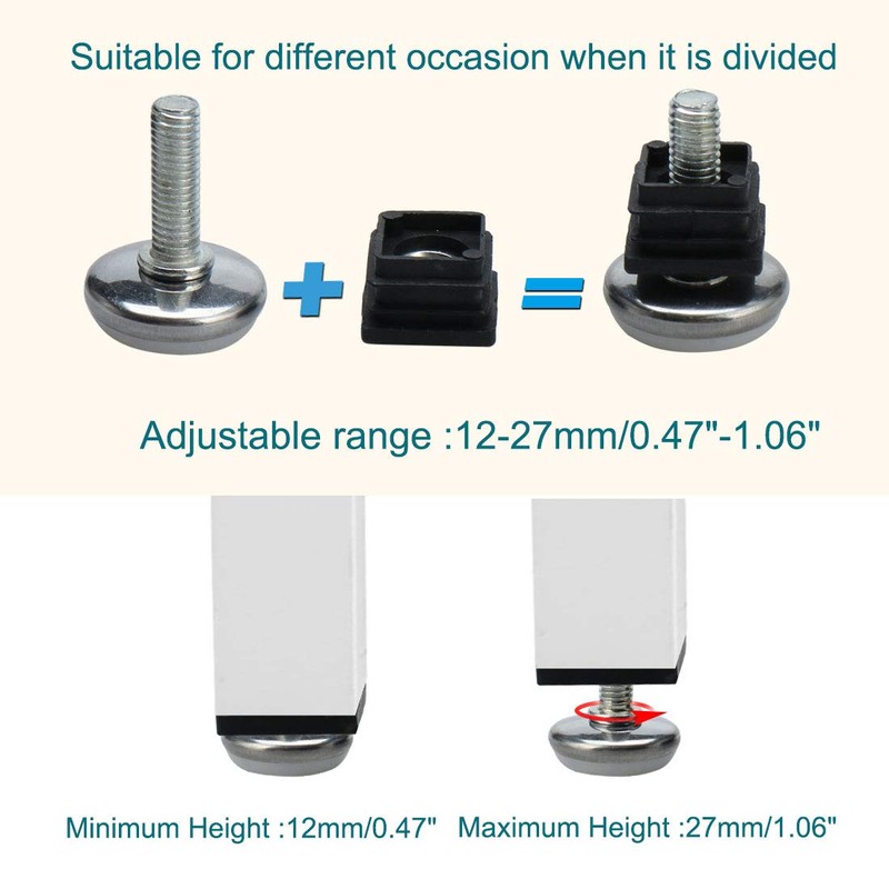 - SIZE - Fit for Mounting Size: 0.67"x0.67"-0.75"x0.75"(L*W); Total Size(Mini): 1.1" x 1.46"(D*H); Total Size(Max): 1.1" x 1.61"(D*H); Insert Total Size: 0.79" x 0.79" x 0.55"(L*W*H); Insert Thread Size: 0.75" x 0.75"(L*W); Leveling Foot Total Size: 1.1" x 1.46"(D*H); Leveling Foot Base Size: 1.1" x 0.35"(D*H); Leveling Foot Thread Size: M8 x 1"(D*L); Leveling Foot Size: M8x1"x1.1"; Adjustable Range of Height: 0.47"-1.06"; Package Include: 8 sets