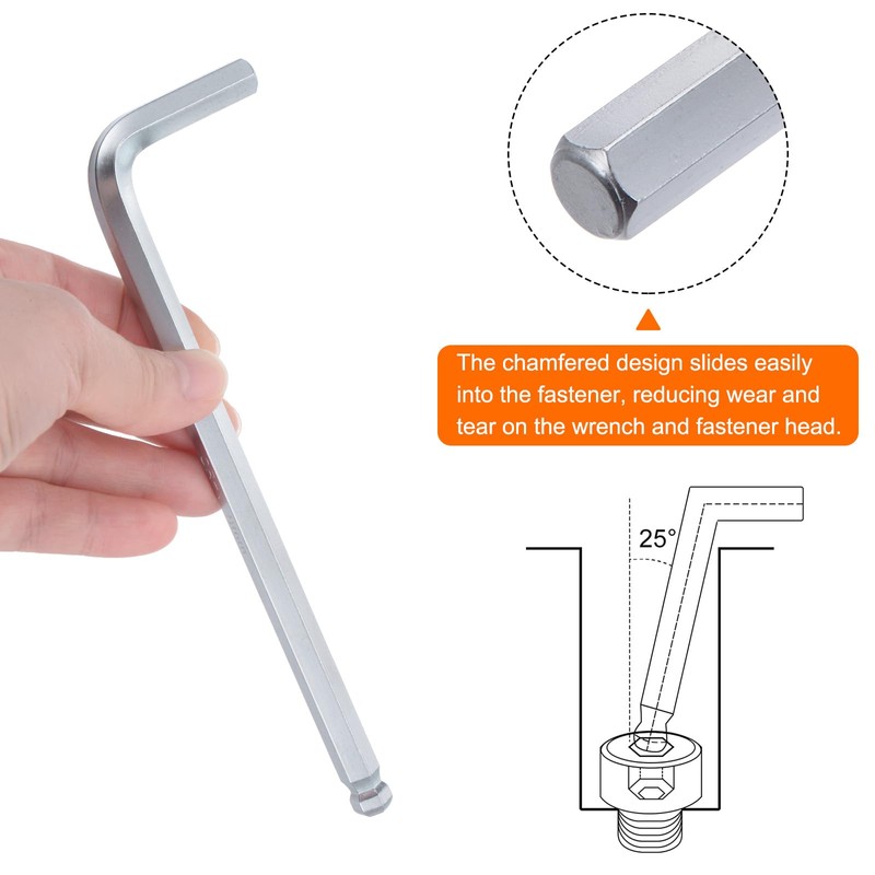 • Chamfered - Chamfered hexagonal ends slide fasteners in easily, reducing wear on wrenches and fastener heads. Designed with a ball end to access socket cap screws with up to a 25-degree entry angle, makes it easy for adjusting in hard-to-touch angles.