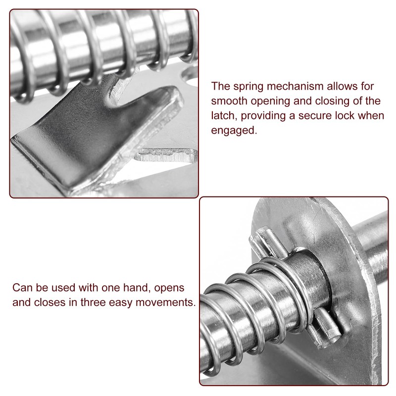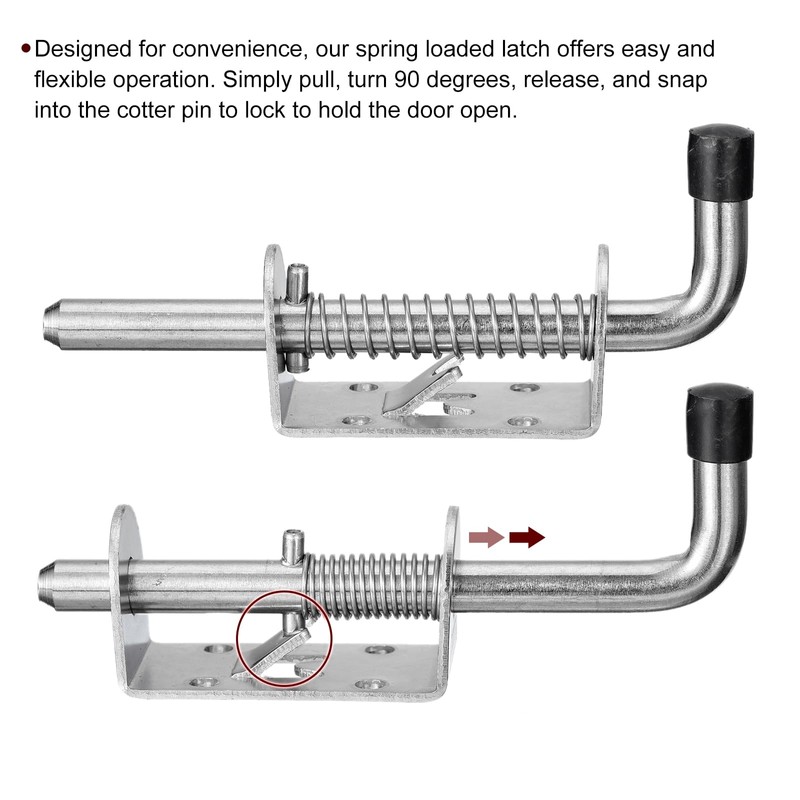 • [Convenient and Flexible Use] - Designed for convenience, our Spring Loaded Latch offers easy and flexible operation. Simply pull, turn 90 degrees, release, and snap into the cotter pin to lock to hold the door open. The spring mechanism allows for smooth opening and closing of the latch, providing a secure lock when engaged.