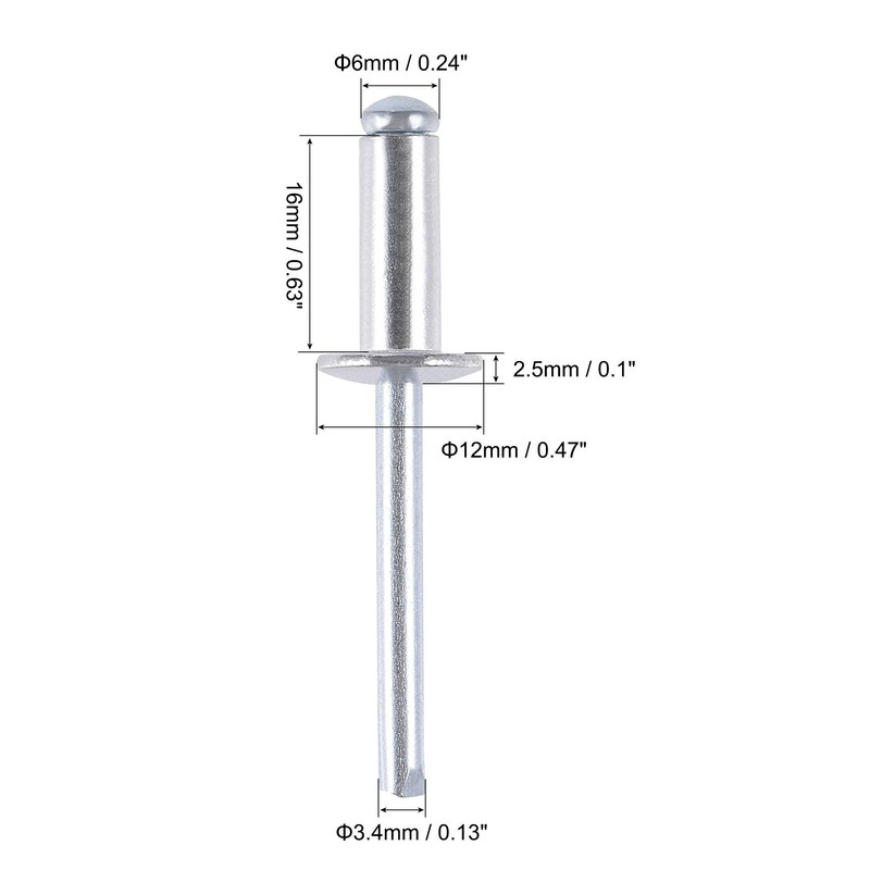 - Features - Material: Aluminum; Rivet Handle Size: 6 x 16 mm / 0.24 x 0.63 inch (D*L); Rivet Mandrel Diameter: 3.4 mm/0.13 inch; Flange Size: 12 x 2.5 mm/0.47 x 0.1 inch (Max.D*T)