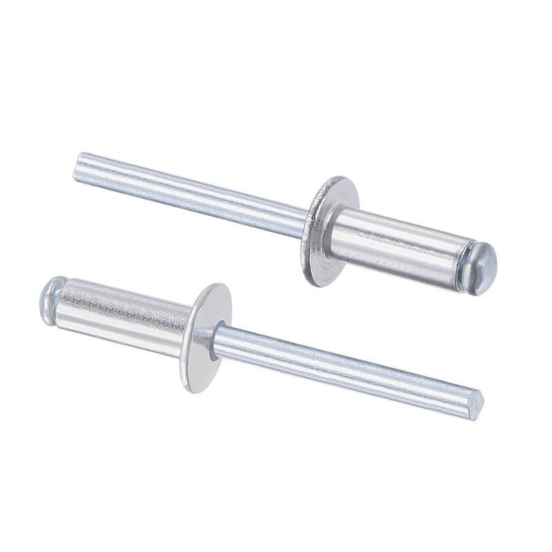 3. Open end blind rivets, breaking mandrel, long rivet body and flat round head.