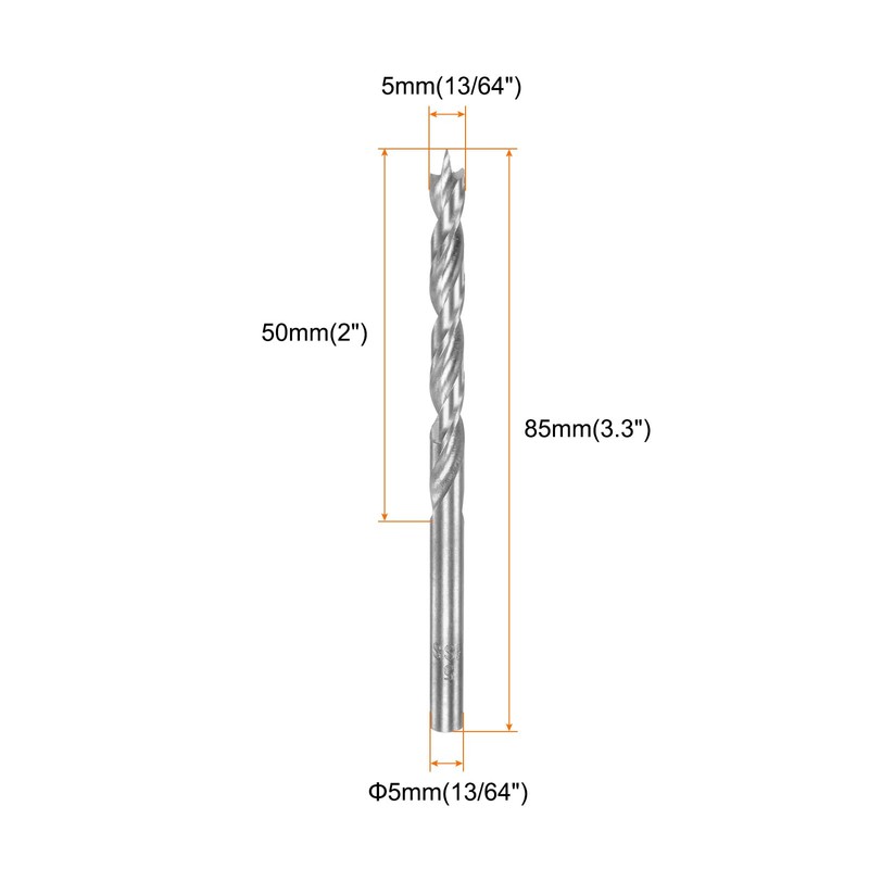 • Size - The brad point drill bit has a diameter of 5mm(13/64") and a straight shank diameter of 5mm(13/64"), an overall length of 85mm(3.3"). The maximum cutting depth can be up to 50mm(2").