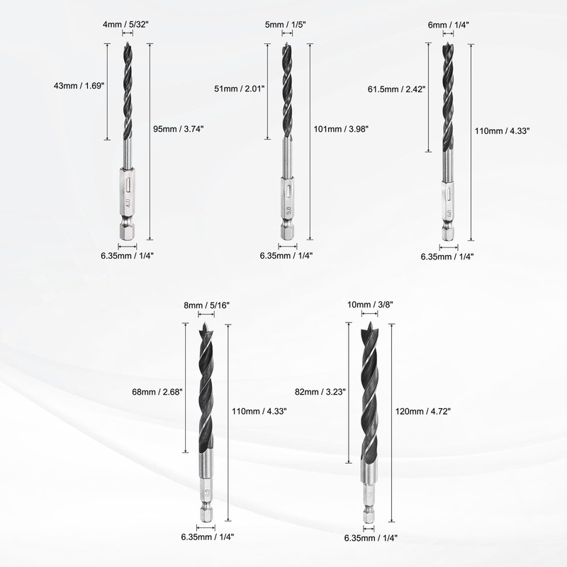 - Size - Drill Diameter: 10mm / 3/8", 8mm / 5/16", 6mm / 1/4", 5mm / 1/5", 4mm / 5/32"; Shank Diameter: 6.35mm / 1/4"; Working Length: 80mm / 3.15", 67mm / 2.64", 61.5mm / 2.42", 50mm / 1.97", 43.5mm / 1.71"; Total Length: 20mm / 4.72", 109mm / 4.29", 112mm / 4.41", 104mm / 4.09", 91.5mm / 3.60"; Shank Type: Hexagonal Shank; Package Content: 5pcs Drill Bits Set (One per size).