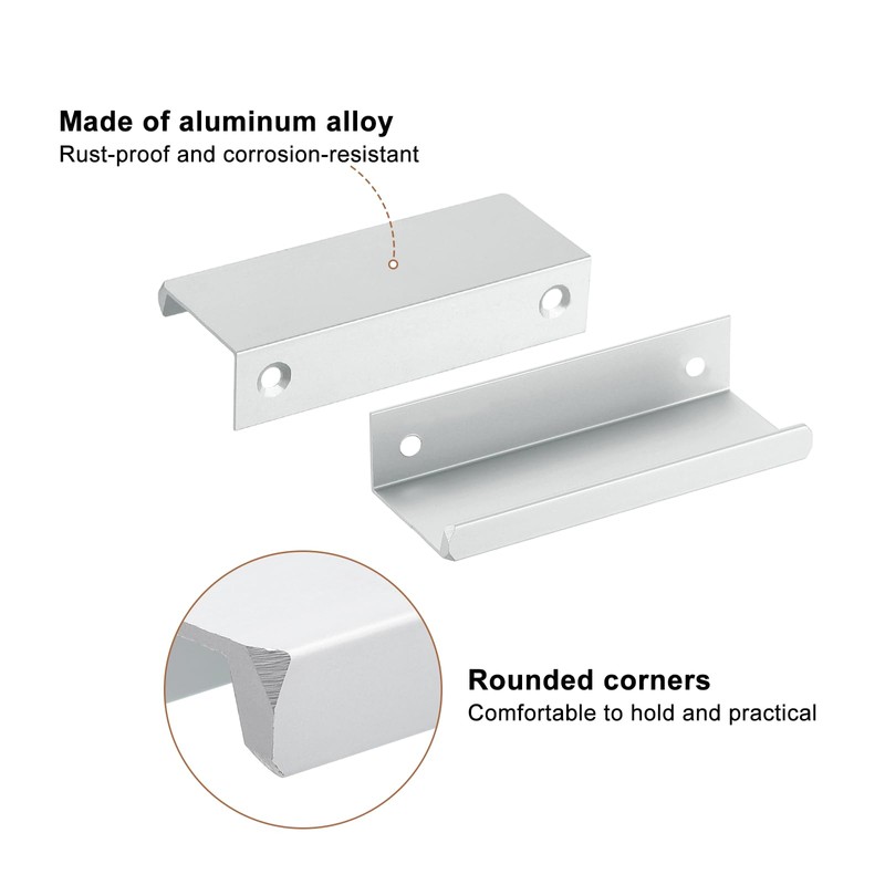 - Parameter: Color: Silver, Material: Aluminum Alloy, Hole Diameter: 4mm / 0.16inch, Hole Distance: 64mm / 2.52inch, Overall Size: 80 x 32 x 17.5 x 1mm / 3.15 x 1.26 x 0.69 x 0.04inch ( L*W*H*T), Package Content: 8pcs x Cabinet Edge Finger Pulls