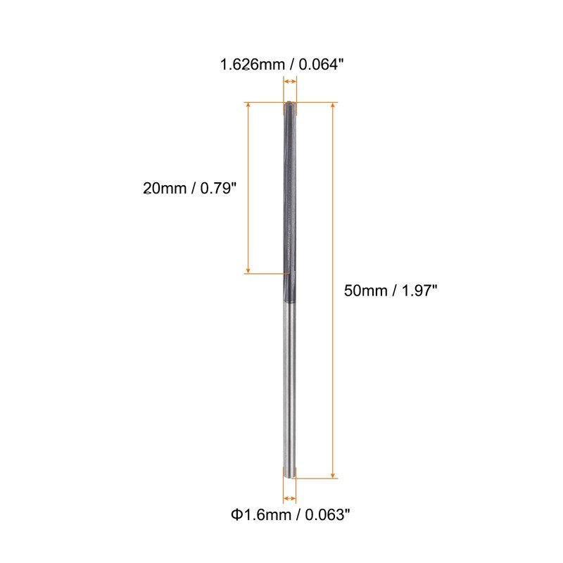 - Size - Cutting Diameter: 1.626mm / 0.064"; Cutting Length: 20mm / 0.79"; Overall Length: 50mm / 1.97"; Shank Diameter: 1.6mm / 0.063"; Reamer Shape: Straight Flute Straight Shank; Color: Black; Coating: Uncoated.