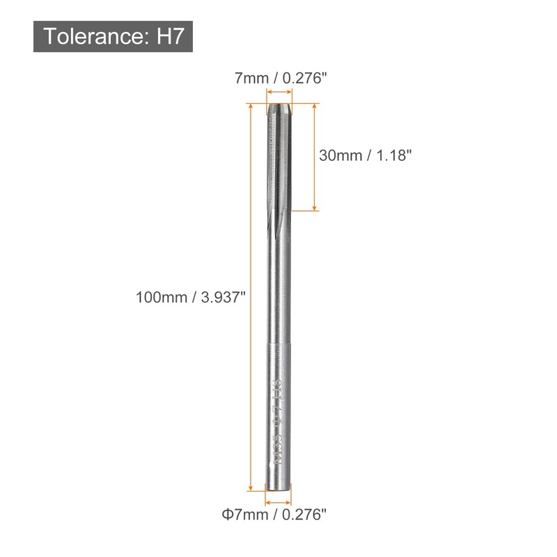 - Reamer Bit Size: Cutting diameter: 7mm / 0.276"; tolerance: H8; cutting flute length: 30mm / 1.18"; shank diameter: 7mm / 0.276"; shank length: 65mm / 2.559"; overall length: 100mm / 3.937"; style: straight flute, round shank