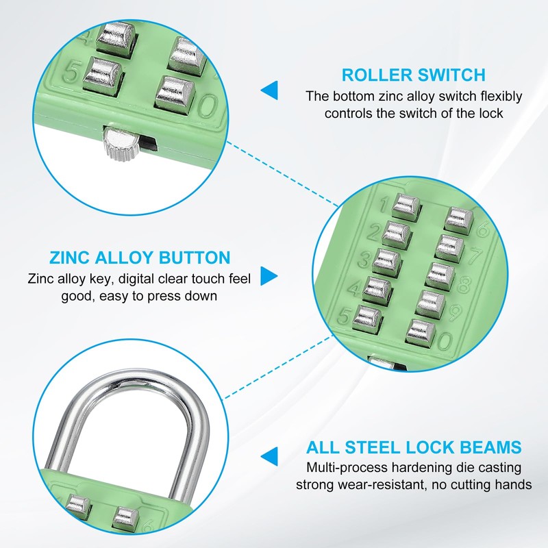 - 10-Digit Combination Padlock with a Push Button Lock offers keyless security solution for your valuables. Suitable for securing lockers, cabinets, luggage, gym, fence, toolbox, and more with ease and efficiency