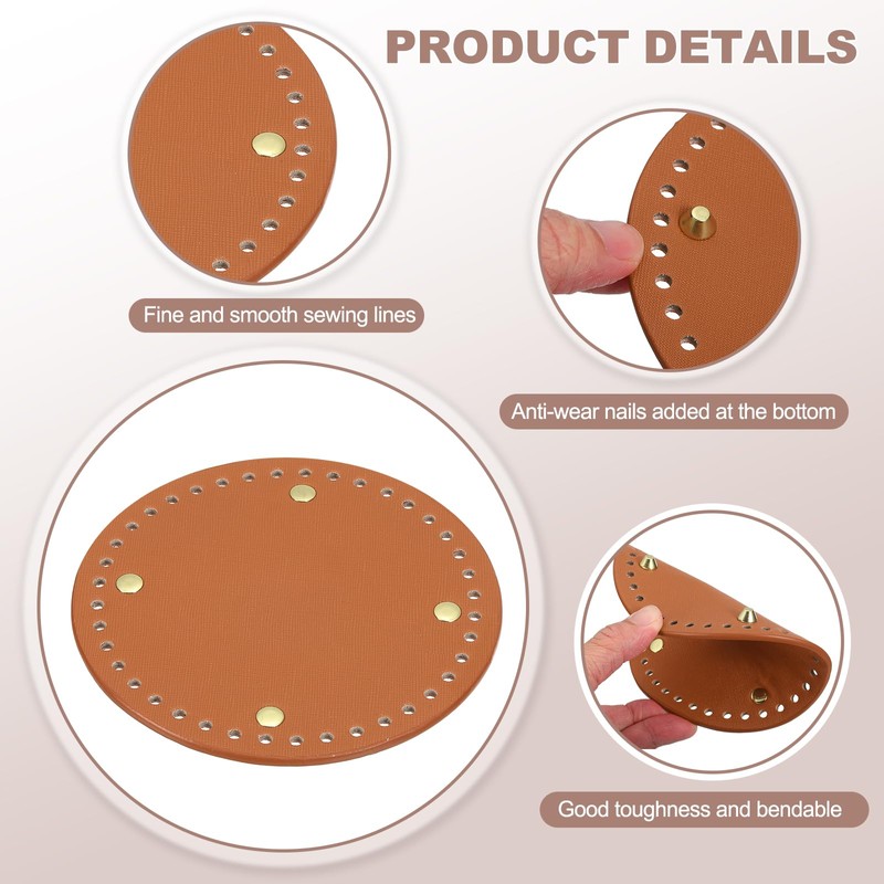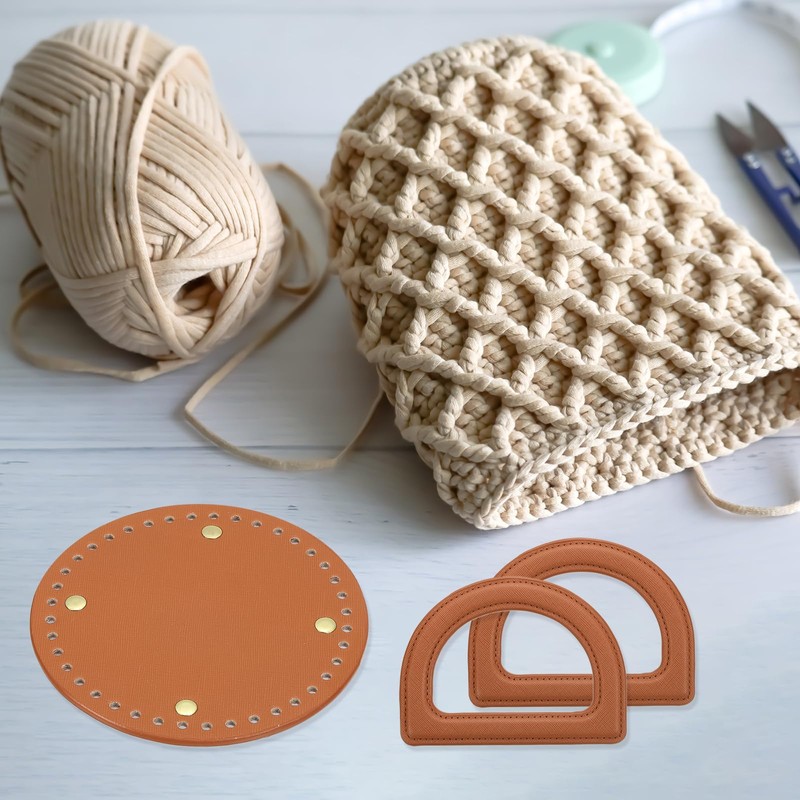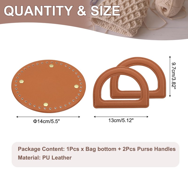 sourcing map Crochet Bag Making Kit, 1Pcs 5.5" Round PU Leather Bag Bottom with 2Pcs D-Shaped Purse Handle Purse Making Supplies for DIY Woven Bag Crochet Handbag, Brown