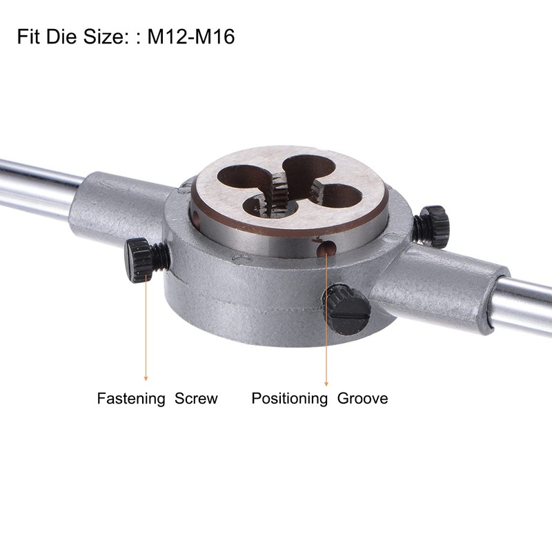 • Die wrench set: 38 mm die fits M12-M16 dies with adjustable screws. M12 x 1.25 threaded round die with 38 mm outer diameter, conical locking opening, strong locking and not loose. The round stamp has good abrasion resistance.