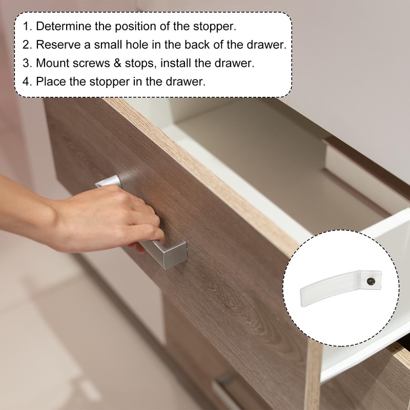 - Easy installation: the installation of these drawer stoppers is quick and effortless. First, determine the position of the stopper. Then reserve a small hole on the back of the drawer. Then attach screws and stoppers, install the drawer and place the stopper in the drawer