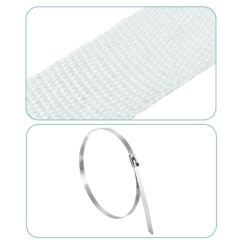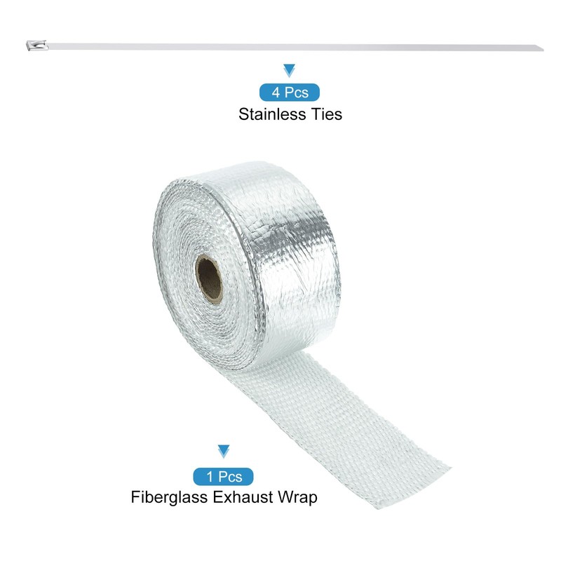- Color: Silvery, Width x Length: 2" x 16' ,Thickness: 1.5mm/0.06", Stainless Ties Length: 30cm/11.8", Packaging includes: 1xFiberglass Exhaust Wrap+4xStainless Ties
