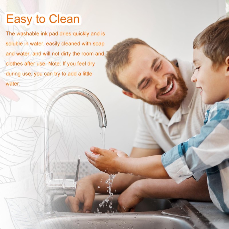 - Easy to Clean: The washable ink pad dries quickly and is soluble in water, easily cleaned with soap and water, and will not dirty the room and clothes after use. Note: If you feel dry during use, you can try to add a little water.