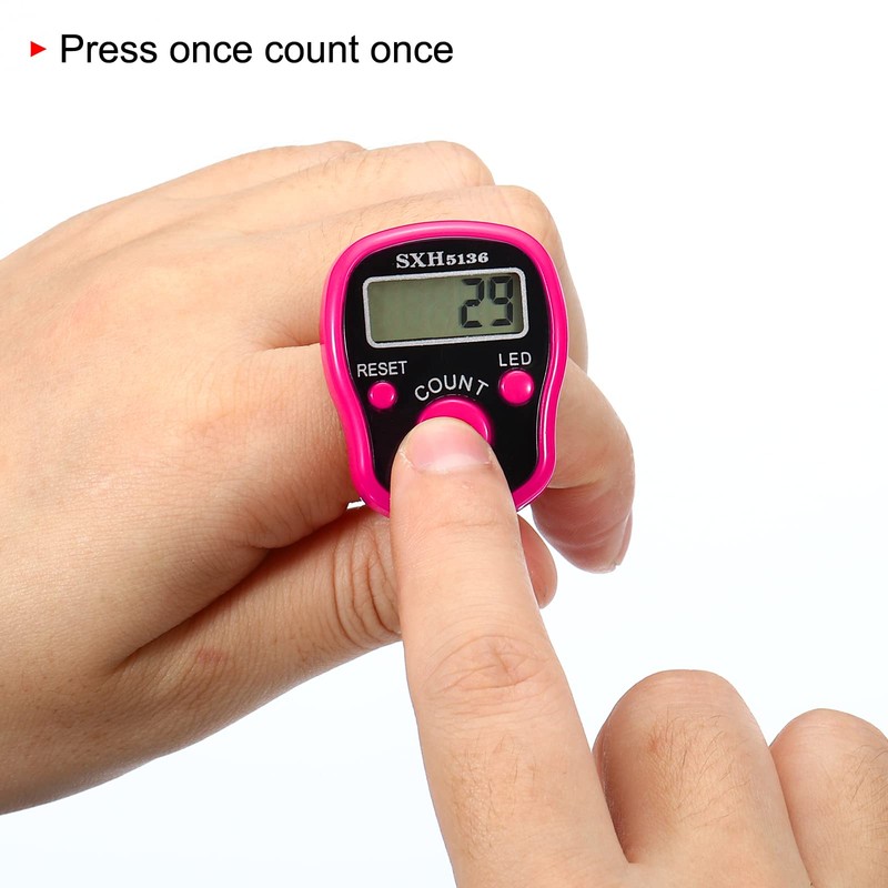 Wear the counter on your thumb or index finger, press once count once. There is a reset button on the left, press the button on the right to turn on the LED backlight.
