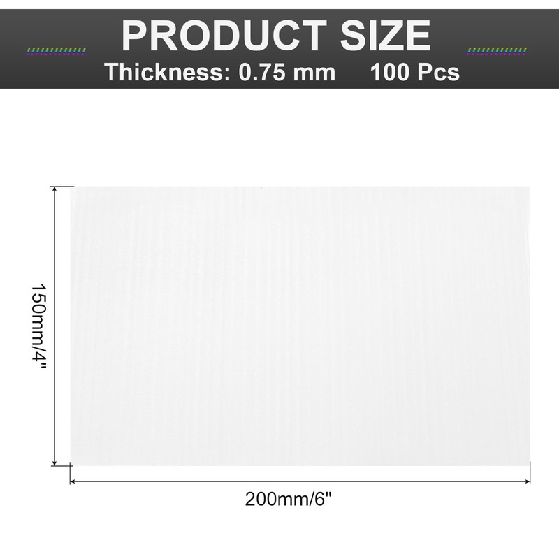 - Material: Foam Paper;Product Size: 150 x 200mm / 6 x 8 Inch (W*L);Thickness: 0.75 mm / 0.03 Inch;Color: White;In the package of: 100 Pcs x Cushion Foam Pouches