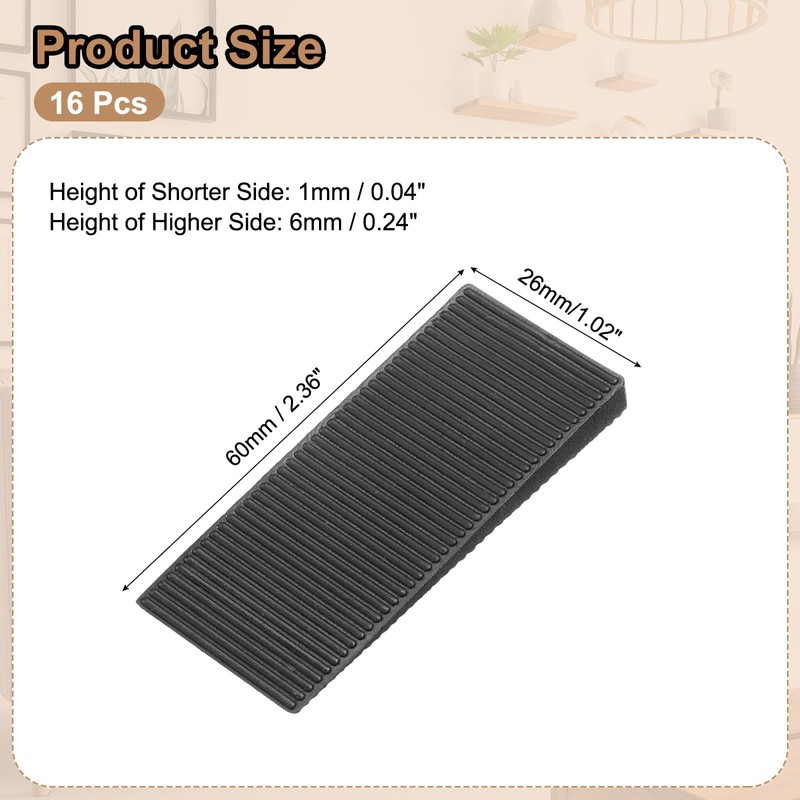 • Color: Black; Wedges Shims Size: 60 x 26mm / 2.36" x 1.02"(L*W); Height of Shorter Side: 1mm / 0.04"; Height of Higher Side: 6mm / 0.24"