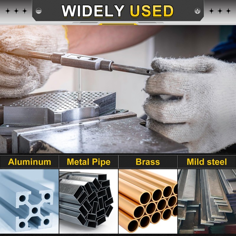 - Wide Applications: Hand taps are mainly used with tap wrenches and are suitable for re-tapping damaged or stuck threads, or to create new threads. The threading tools are used for tapping through or shallow holes in mild steels, aluminum, iron, copper, hard plastic.
