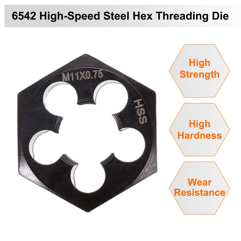 - Material - Hex threading dies are made from high speed steel (HSS) 6542, which offers excellent hardness, wear resistance, and heat resistance for durability and extended tool life. Precise, clean threads can be produced on a variety of materials including metal, plastic and wood.