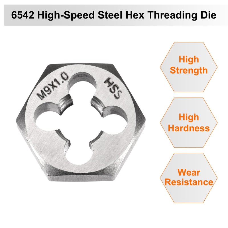 - Material - Hex threading dies are made from high speed steel (HSS) 6542, which offers excellent hardness, wear resistance, and heat resistance for durability and extended tool life. Precise, clean threads can be produced on a variety of materials including metal, plastic and wood.