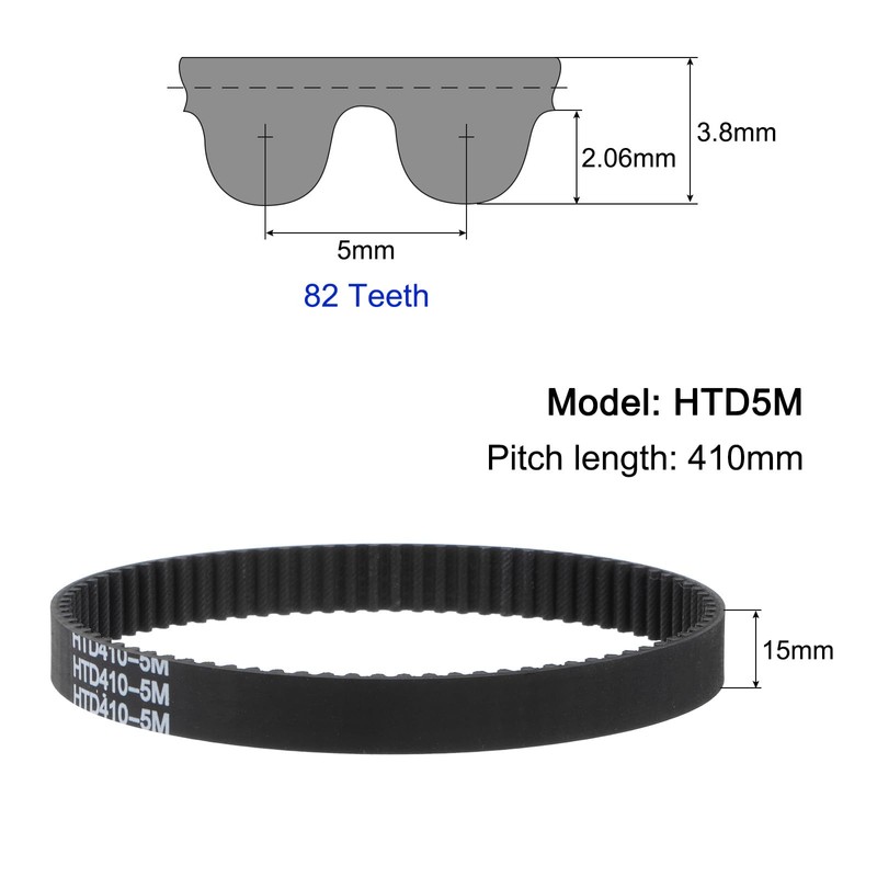 - Size: HTD5M (High Torque Drive) timing belt with 15 mm width, 410 mm outer circumference, 82 teeth, curved shape for better power transmission and reduces the risk of slipping.