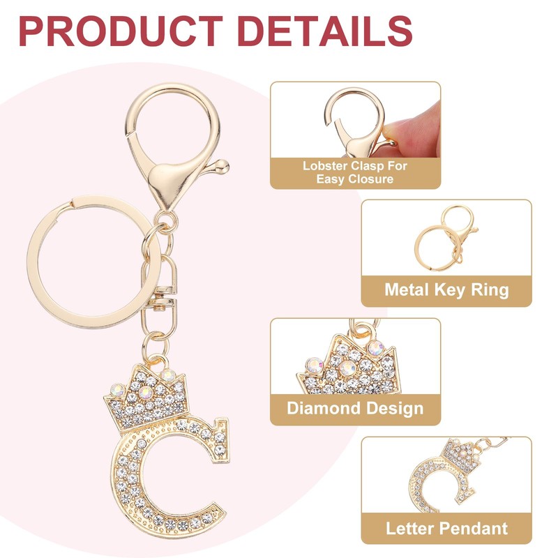 sourcing map Initial Letter Keychains, Pendant Key Chain Keyring Holder Car Bags Charm Accessory, Purse Handbag Backpack Bling Rhinestones for Women, Gold-C