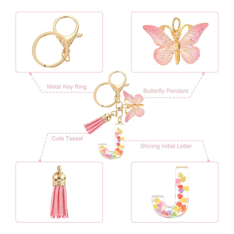 sourcing map Initial Letter Keychains, Resin Cute Butterfly Tassel Pendant Accessory for Women, Alphabet Key Ring for Purse Handbags Backpack, Pink-J