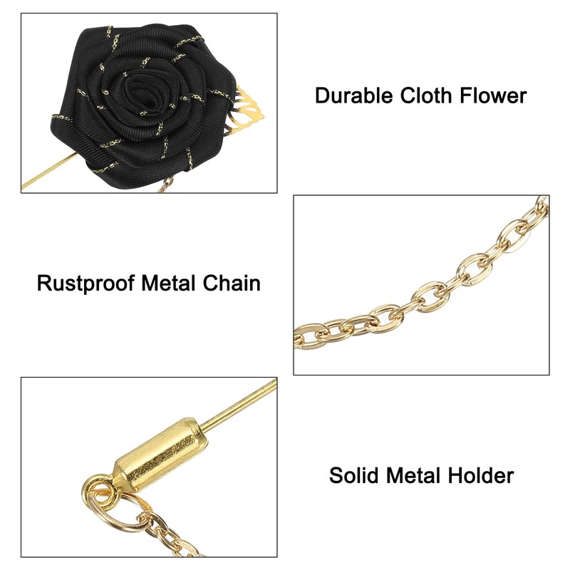 - The black cloth, alloy rose lapel stick , is in the size of: Flower Dia: 4cm / 1.57inch, Chain Length: 9 cm / 3.54 inch, Stick Length:5.5 cm / 2.17 inch,weight: 6 g / 0.01lb, In the package of: 1 x Rose Lapel Stick