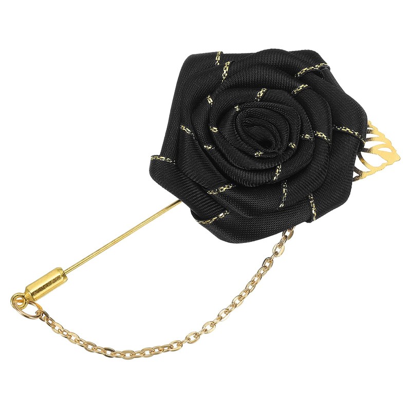 sourcing map Lapel Pin for Men Size: 1.57 inch Cloth Alloy Rose Flower Pin Suit Lapel Stick with Gold Leaf & Trim/Tassel Chain Brooch for Bridegroom Wedding 1 Count Black