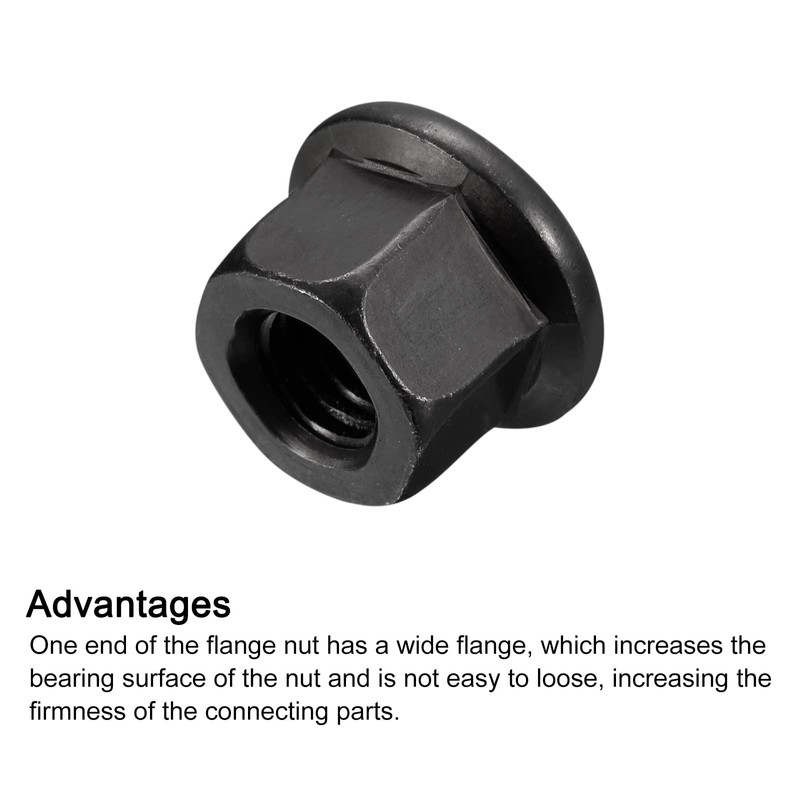 • Material: A flange hex nut is made of carbon steel, a black oxide finish that has the function of rust prevention, corrosion resistance, high strength, durable.