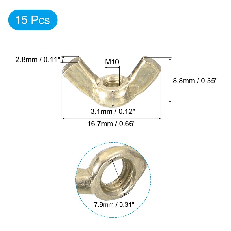 - [Basic Information] The thread specification of this wing nut is M10x1.5", the bottom diameter of the nut is 7.9mm/0.31inch, the nut thickness is 3.1mm/0.12inch, the handle thickness is 2.8mm/0.11inch, and the total size is 16.7x8.8mm/0.66x0.35inch(W*H), there are 15 Pcs wing nuts in the package, which is sufficient to meet your daily needs.