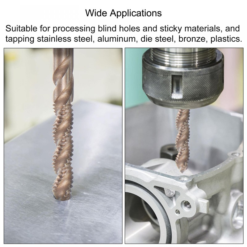 • Spiral groove tap: spiral groove design, upward chip removal, right-hand thread cutting, fast and accurate thread cutting. Suitable for processing blind holes and sticky materials as well as for thread cutting aluminium, tool steel, stainless steel, bronze, hard plastics, etc.