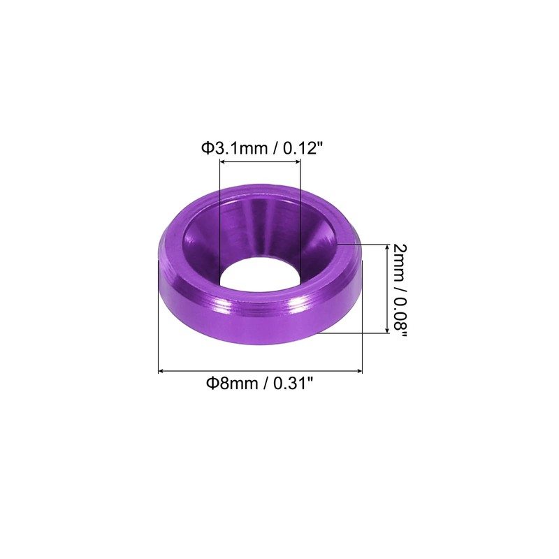 - Screw Gasket,is in size of:Washer dimensions,Outer diameter:8mm/0.31 inch;Hole diameter:3.1mm/0.12 inch;Thickness:2mm/0.08 inch;Color:Purple;Material: Aluminum Alloy;In the package of:20 pcs M3 Countersunk Washers;