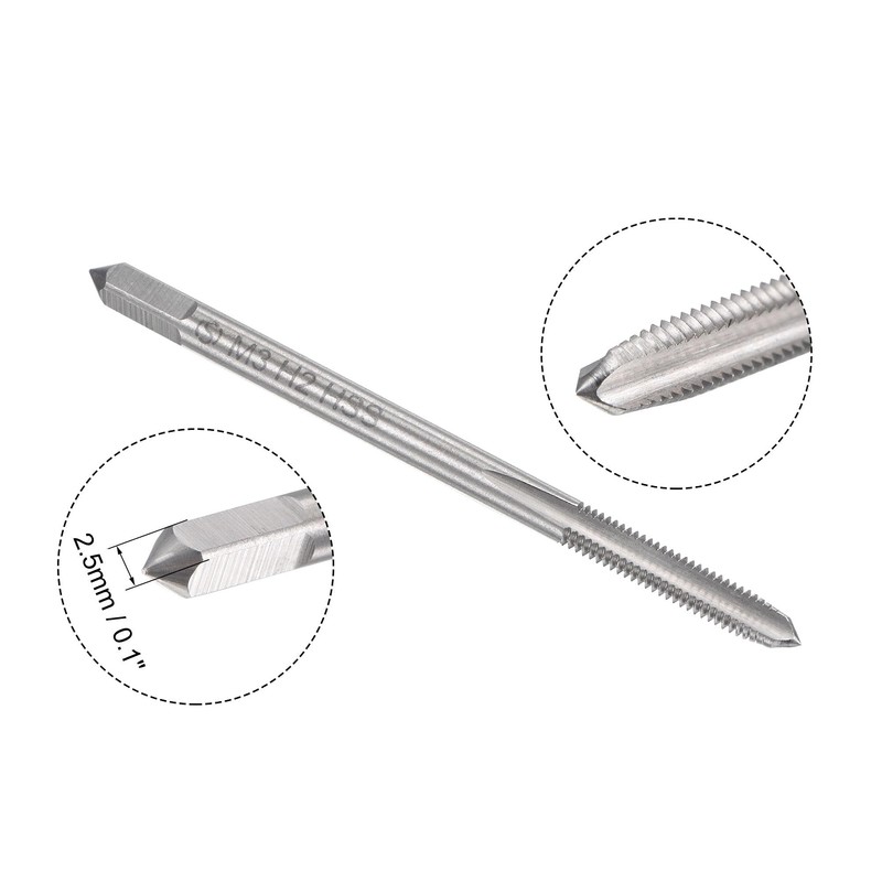 Thread Size: M3 x 0.5mm; Thread Length: 16mm / 0.63"; Overall Length: 52mm / 2.05"; Square Shank Size: 2.5mm / 0.1"; Tolerance Grade: H2; Material: High Speed Steel (HSS), Flutes Quantity: 3 Flutes