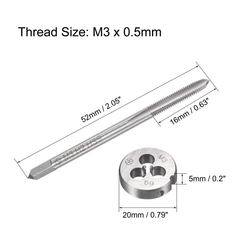 - Tap & Die Set: M3 x 0.5 metric tap and die set can make new threads or re-thread damaged or jammed threads, good for general purpose applications. Clear threads without burrs, right hand tapping direction.