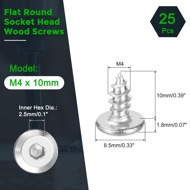 sourcing map M4 x 10mm (25 Pack) Flat Round Socket Head Screws, Stainless Steel Self Tapping Full Thread Hex Socket Cap Screws for Wood Furniture