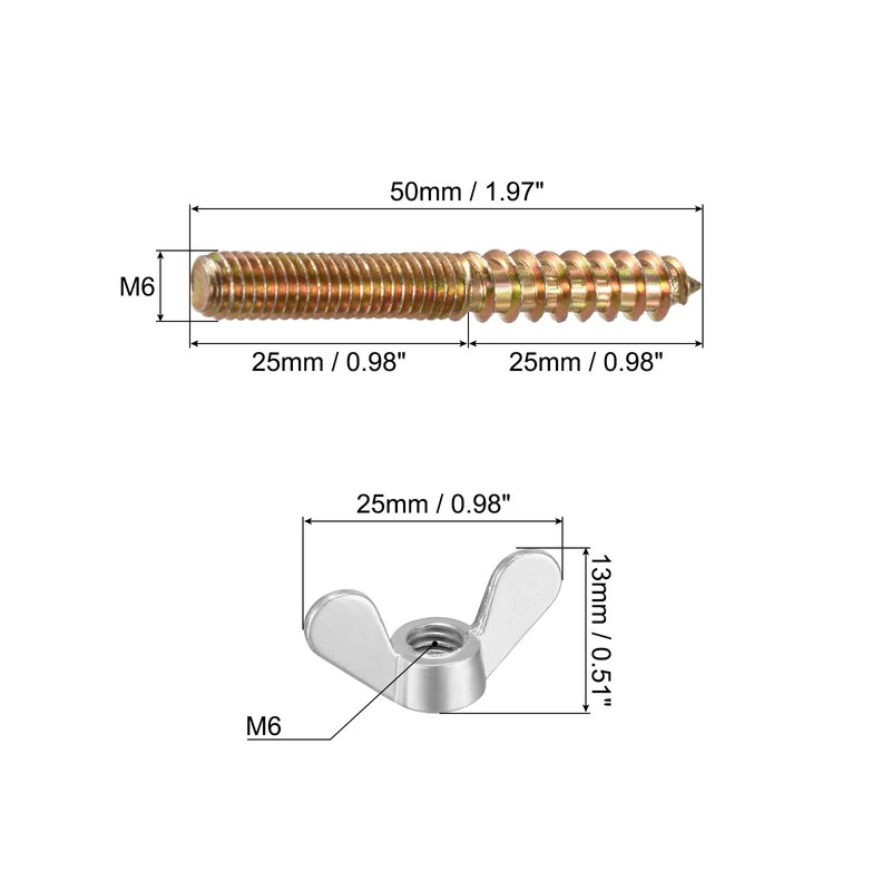- Type 2: Product Name: Hanger Bolt; Material: Carbon Steel; Finish: Zinc Plated; Main Color: Brass Tone; Thread Diameter: M6; Total Length: 50mm / 1.97-inch; Wood Screw Thread Length: 25mm / 0.98-inch; Machine Screw Thread Length: 25mm / 0.98-inch