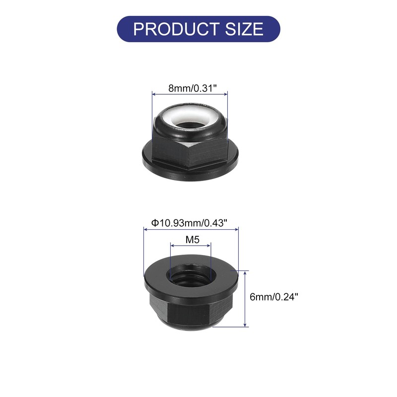 - Package contains: 100 pcs x Lock Nylon Bolts Nuts; Thread Size: M5; Total Length: 6mm/0.24"; Thread Diameter: 5mm/0.2"; Flange Diameter: 10.93mm/0.43"; Pitch: 0.8mm/0.03"; Hex Width: 8mm/0.31".