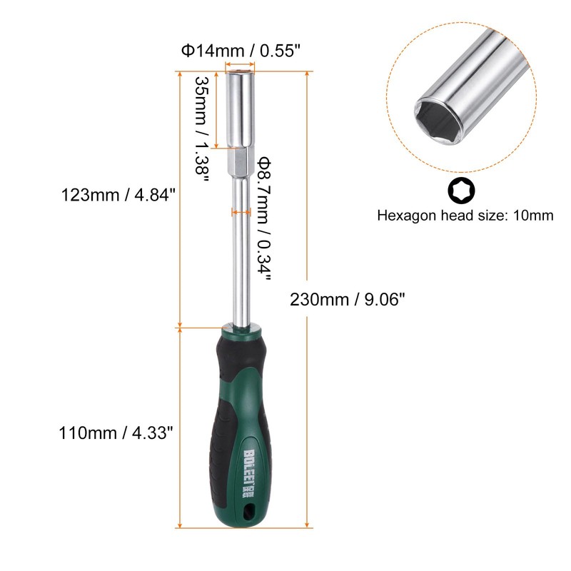 - Size - 14mm; Total Length: 230mm / 9.06"; Shank Length: 123mm / 4.84"; Shank Diameter: 8.7mm / 0.34"; Socket Outer Diameter: 14mm / 0.55"; Socket Length: 35mm / 1.38"; Socket Inner Depth: 31mm / 1.22"