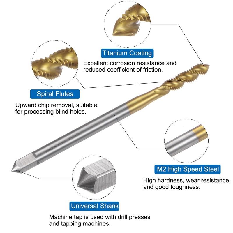 Spiral flute threading tap is suitable for processing blind holes and sticky materials. Used for drilling and tapping stainless steel, aluminum, die steel, ordinary steel, non-ferrous metals, and hard plastics.